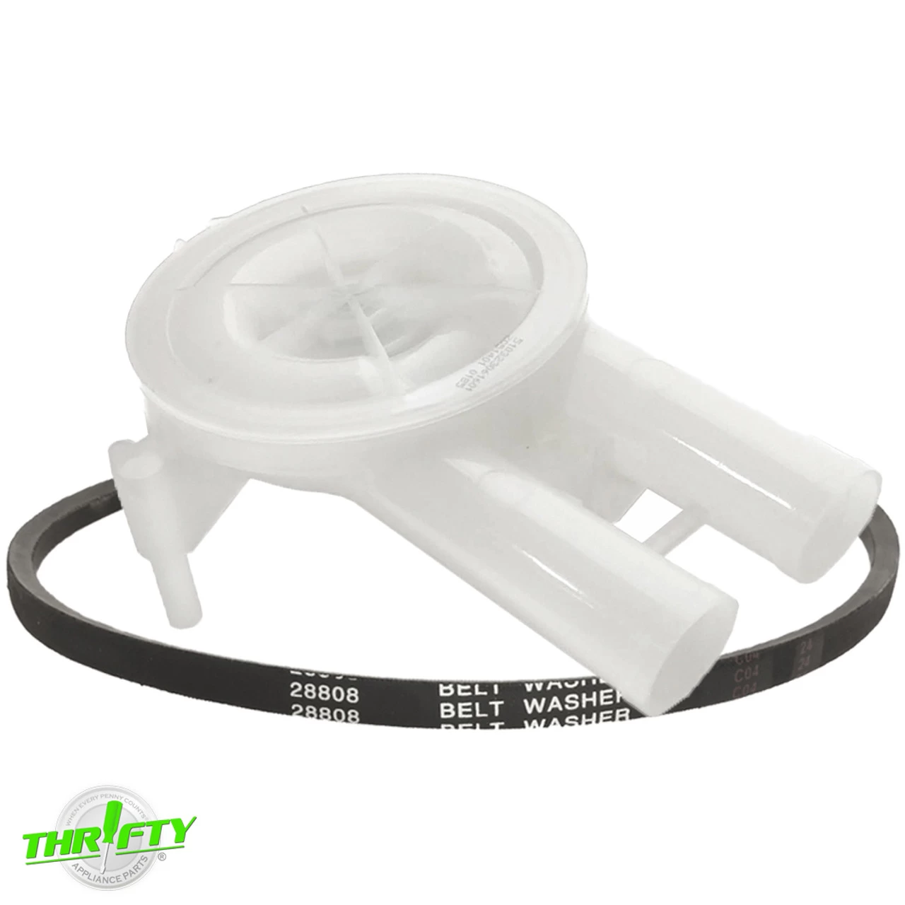 Replacement drain pump and drive belt used for some Amana and Danby washer models.