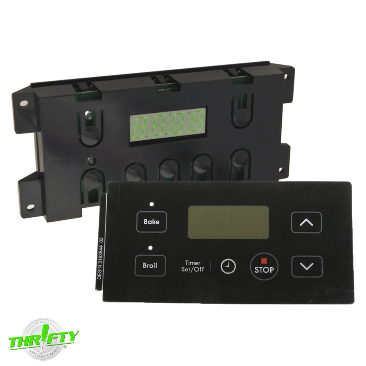 Replacement control board and overlay set used on some Frigidaire and Kenmore range models.