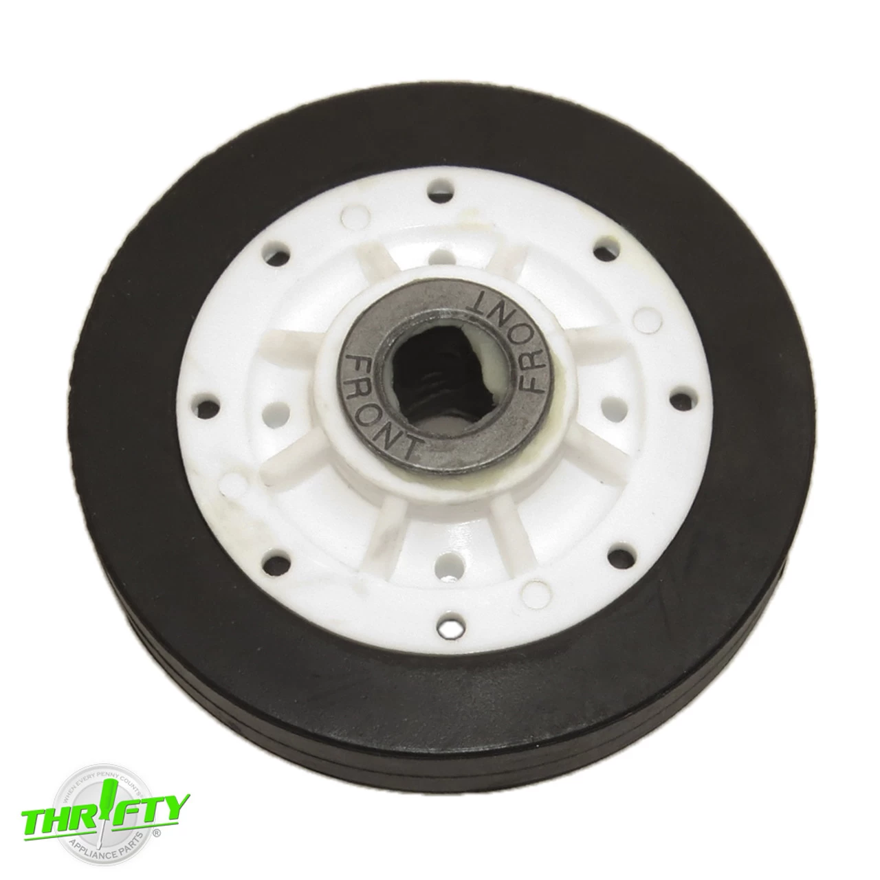 Replacement drum support roller used for some Admiral, Amana, Bosch, Crosley, Danby, Kenmore, Magic Chef, Maytag, and Speed Queen dryer models.
