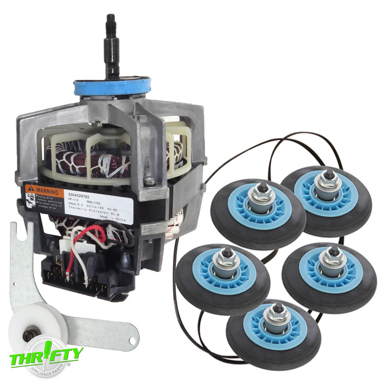 Replacement drum drive motor, rollers, idler pulley, and belt used for some Electrolux, Frigidaire, and Kenmore dryer models.