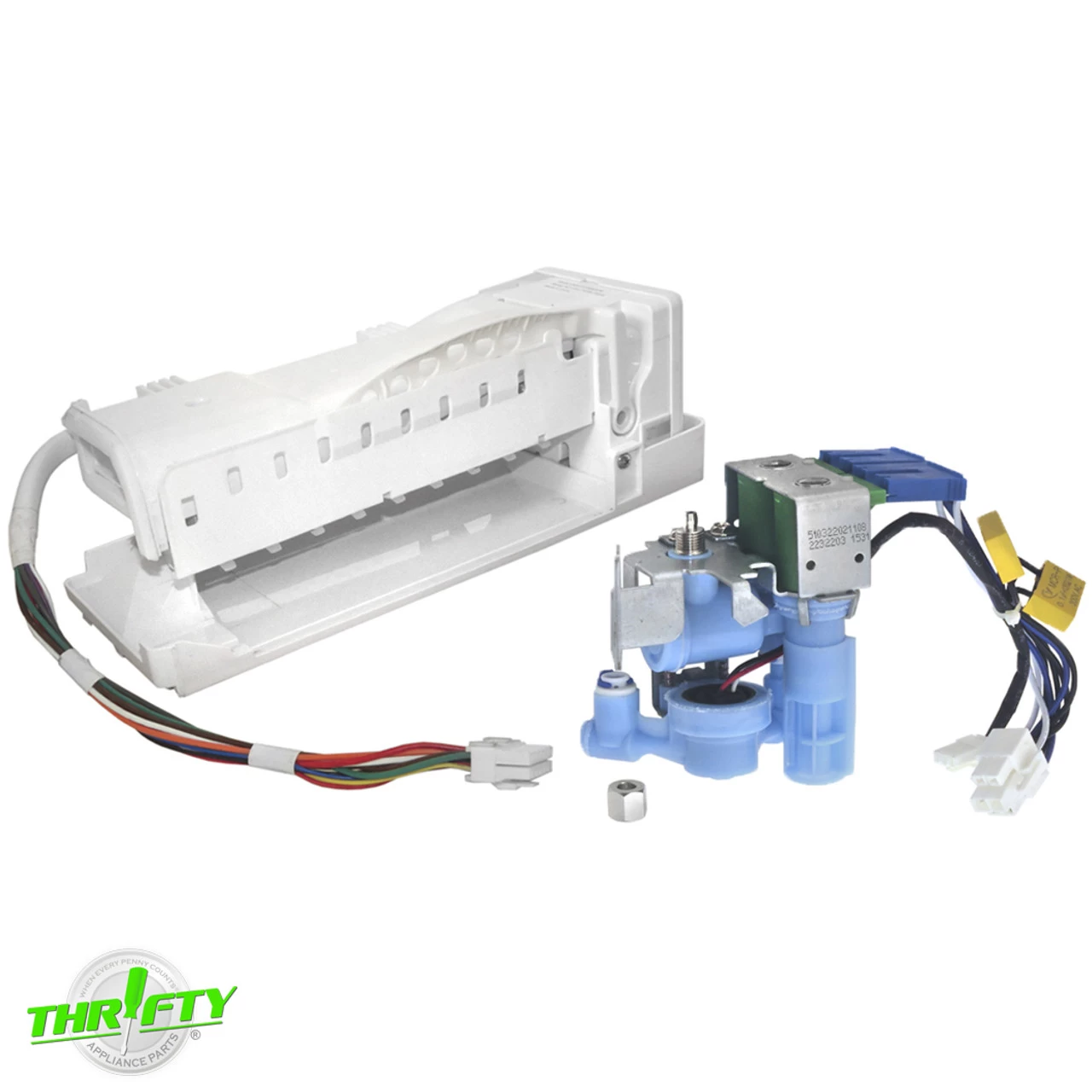 Replacement ice maker and water inlet valve used for some Samsung refrigerator models.