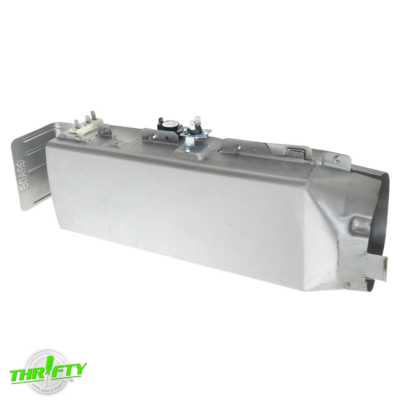 Replacement complete heater assembly with housing, thermostat, and fuse used for some Samsung dryer models.