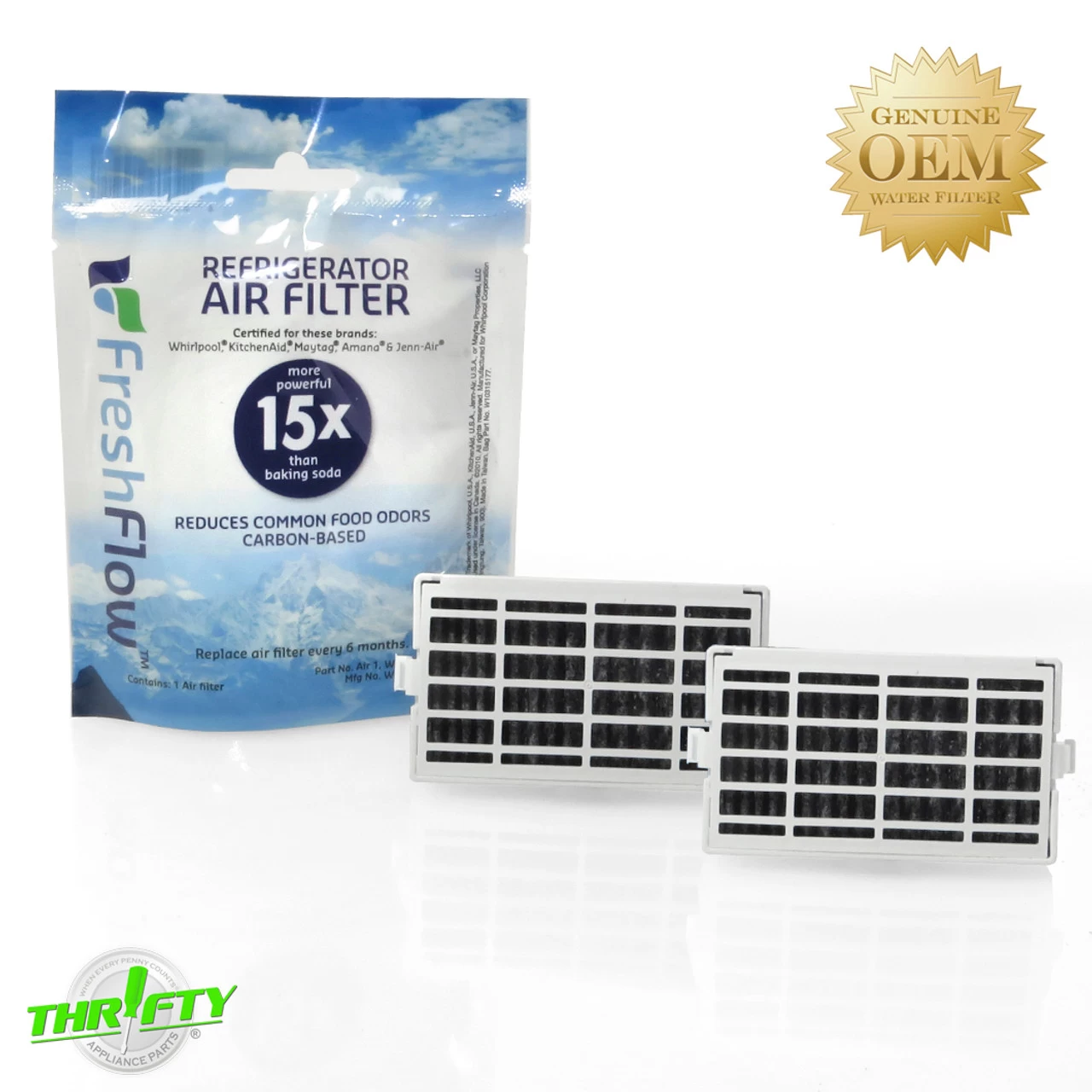 Air filter used on various Amana, Ikea, Jenn-Air, Kenmore, KitchenAid, Maytag, and Whirlpool refrigerators.