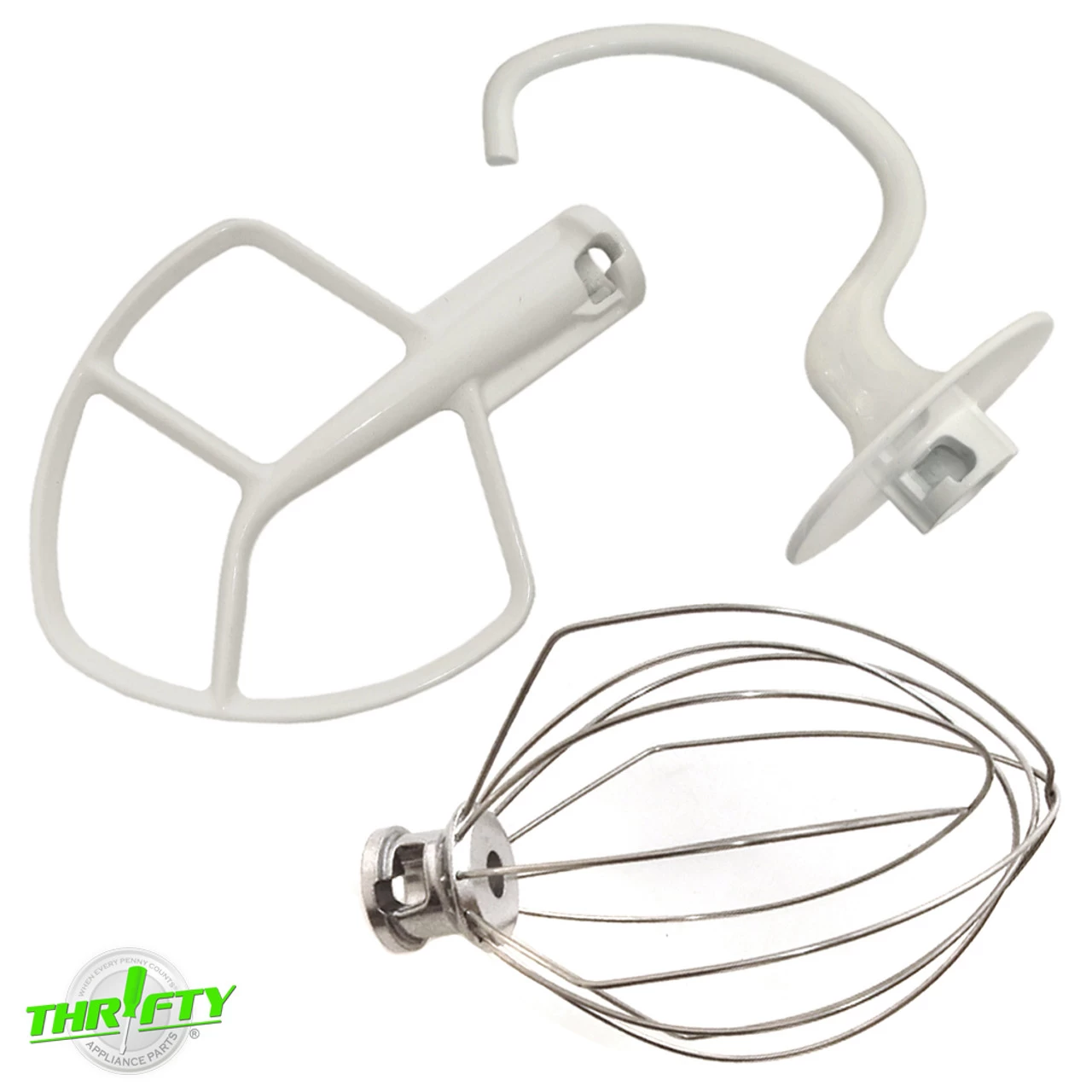 Replacement flat beater, dough hook, and wire whip used for some KitchenAid and Whirlpool lift bowl mixer models.
